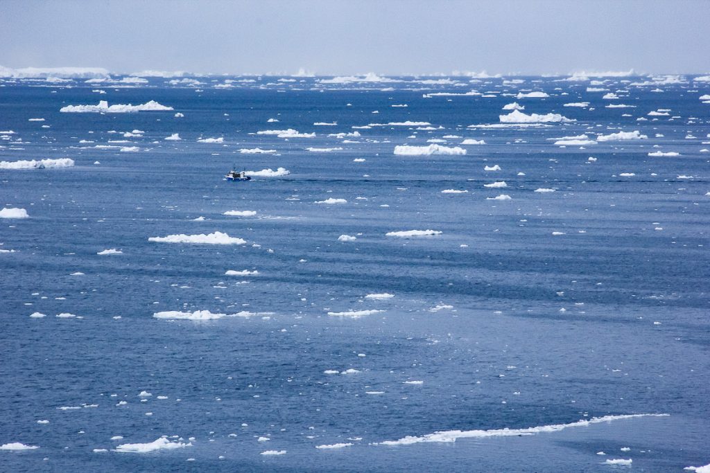 O ambarcatiune de pescari pare pierduta printre blocurile de gheata.