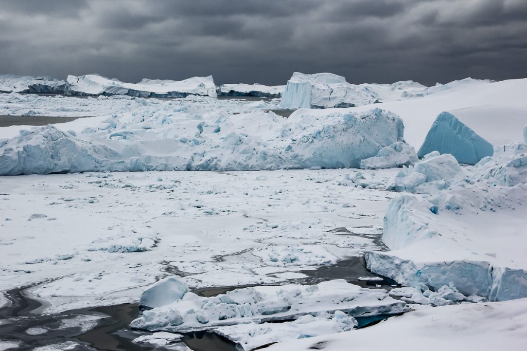 Ma uit de sus la blocurile imense de gheata, pe care le-am vazut si de jos, cand am fost cu vaporasul. Si imi aduc aminte ca ele sunt desprinse din ghetarul Sermeq Kujalleq – cel mai productiv ghetar din Emisfera Nordica! Acesta are o viteza inspaimantatoare: inainteaza 20 de metri pe zi in timpul iernii si 40 de metri vara!