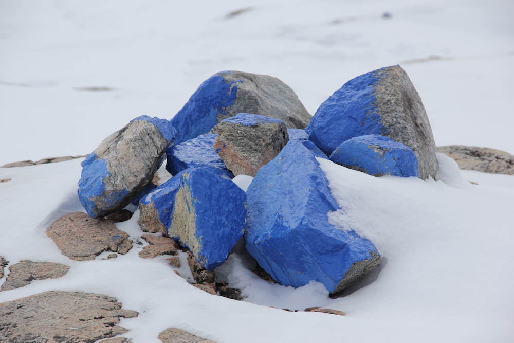 Suntem pe traseul albastru, dupa cum ne anunta si vopseaua de pe gramada de pietre… Traseu care nu se mai terminaaaa. Si pe care bate un vant, neneeee, de iti ingheata mucii-n nas!