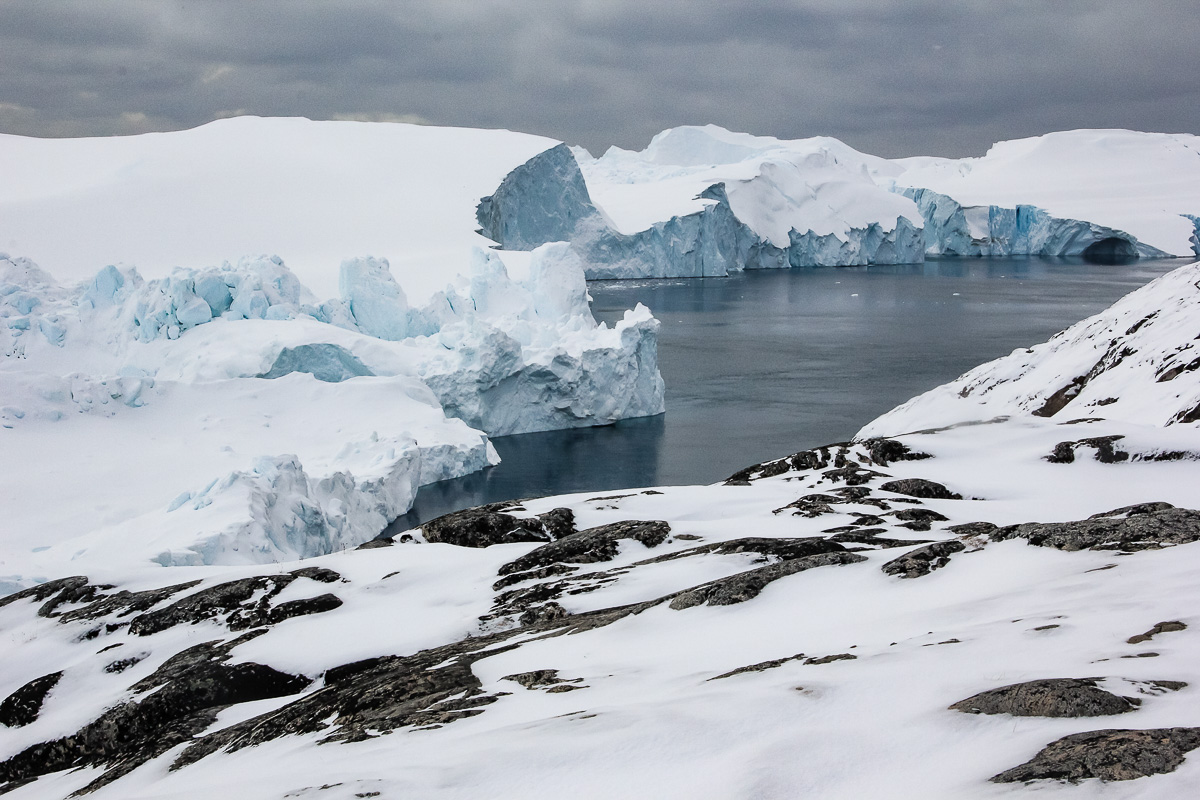 Ma uit de sus la blocurile imense de gheata, pe care le-am vazut si de jos, cand am fost cu vaporasul. Si imi aduc aminte ca ele sunt desprinse din ghetarul Sermeq Kujalleq – cel mai productiv ghetar din Emisfera Nordica! Acesta are o viteza inspaimantatoare: inainteaza 20 de metri pe zi in timpul iernii si 40 de metri vara!