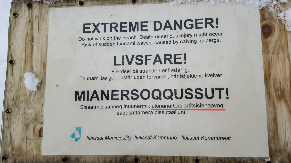 Pe drumul nostru in coborare, dam de un afis batut in lemn. Partea naspa nu e ce scrie acolo, ci… cum sa citesti al 4-lea cuvant din propozitia groenlandeza 🙂 Ulorianartorsiortitsisinnaavoq. Ia-o p’asta…